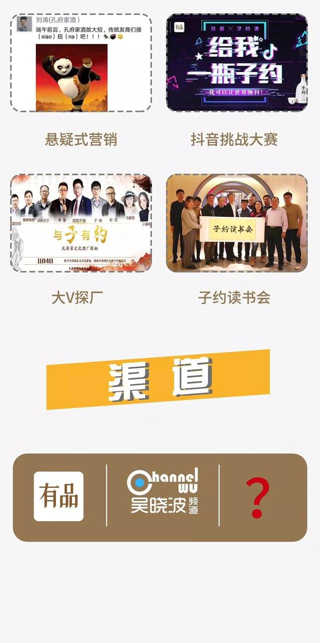 2019年1月14日,一則名為“2018年酒業最大錦鯉”的圖片在酒業朋友圈瘋傳。圖片內容涵蓋中國網紅白酒子約在2018年所獲榮譽(國家品牌食品創新獎、小米平臺白酒單品銷量第一、入選吳曉波“新匠人新國貨”品牌計劃)、產品賣點(真年份、可追溯、非遺大師釀造)、創新營銷(懸疑式營銷、抖音挑戰大賽、大V探廠、子約讀書會)及購買渠道(小米有品、吳曉波頻道)。值得注意的是,渠道處留有“?”,給公眾留下想象空間。