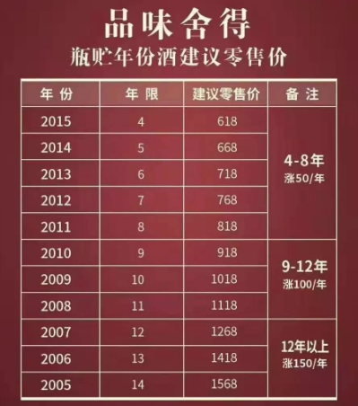 10月16日,舍得酒業發布《品味舍得瓶貯年份酒建議零售價》,從售價表中可以看到,品味舍得對2005年到2015年生產的年份酒給出了不同定價:4-8年漲50元/年,9-12年漲100元/年,12年以上漲150元/年。