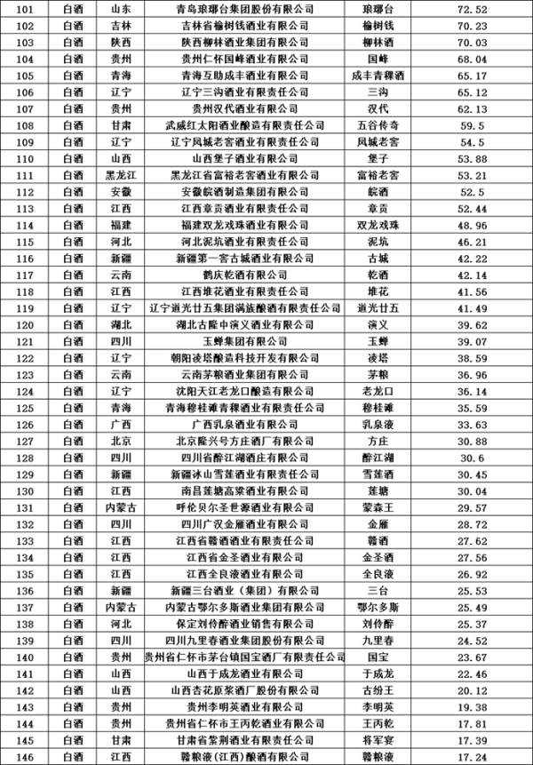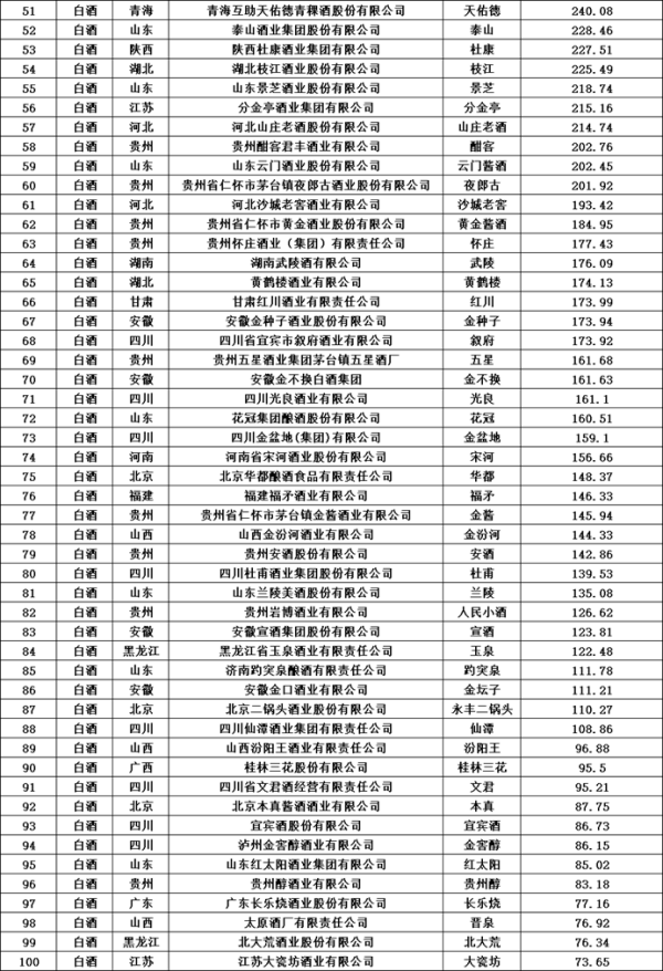 華樽杯第十七屆中國酒類品牌價值200名單如下:
