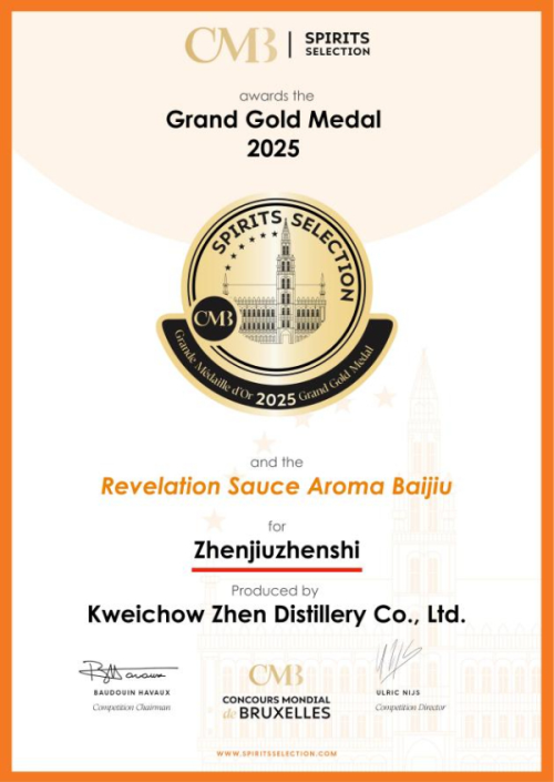 在2025年布魯塞爾國際烈性酒大獎賽中,貴州珍酒產品“珍酒·珍十”從來自70個國家和地區的2598款酒樣中脫穎而出,榮獲賽事最高獎——大金獎。