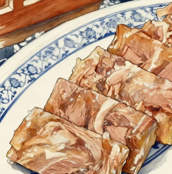 紹興的壓板羊肉更見巧思。取整塊羊腿肉,去皮留脂,用莧菜梗鹵汁浸透。以青石板相壓,置陰涼處凝凍三日。食時切片裝盤,透光的肉凍里嵌著細密的花紋,蘸些南乳汁入口,清涼滑膩竟似葷腥里的冷香丸。老食客最喜以此物佐酒,配一碟茴香豆,能在屋檐下消磨整個午后。