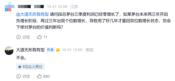 近期,有雪球網友就茅臺第三季度利潤下滑向段永平提問:“如果茅臺未來兩三年開啟負增長,您會修正對茅臺的價值判斷嗎?”