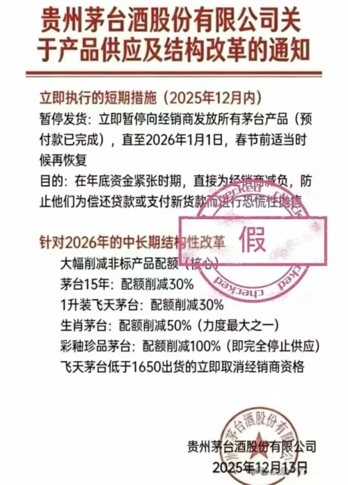 該文件落款日期為“2025年12月13日”。此后的12月15日,有媒體向茅臺官方求證,茅臺方面明確回復:“這個文件是假的。”
