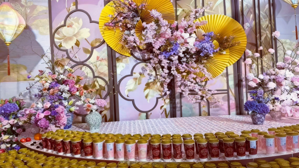 12月15日,江蘇常州中吳賓館。一場中式婚禮在此舉行,引人注目的是,宴席上整齊擺放的、杯套印有“俊杰&海純 佳偶天成”字樣的霸王茶姬飲品。到場賓客幾乎人手一杯,仿佛這不是一場私人婚宴,而是一場大型品牌品鑒會。
