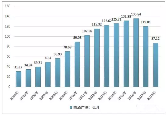2018年我國白酒行業總產量達到87.12億升。相對于2016年有大幅度的下滑,白酒產量的大幅度下滑主要是由于環保限制,產業整合,茅臺五糧液一直到二鍋頭這些品牌酒份額大幅提升,地方小酒廠的一批關停。