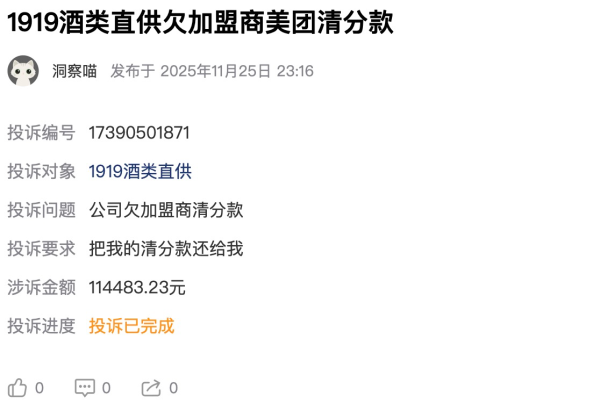 佳釀網注意到,直至11月25日,黑貓投訴平臺上仍有供應商發布關于1919拖欠貨款的投訴信息,顯示相關資金糾紛仍在延續。