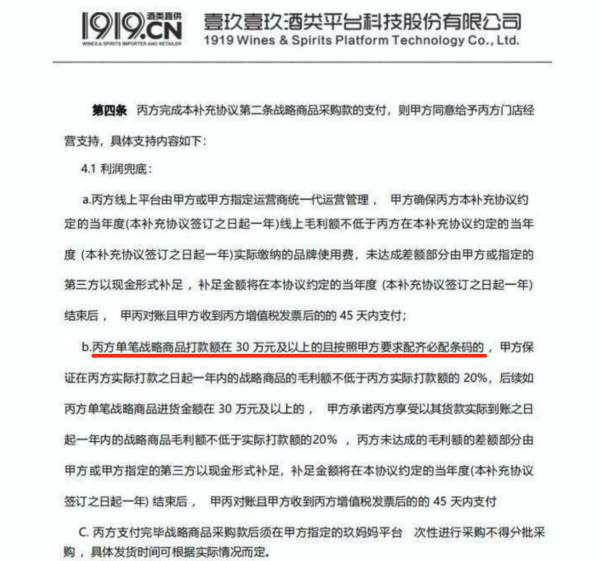 據南方周末報道,7月以來,1919強制要求加盟商簽訂“升維協議”,協議要求加盟商一次性采購30萬元戰略品,完成采購款支付后,則1919同意給予門店經營支持。